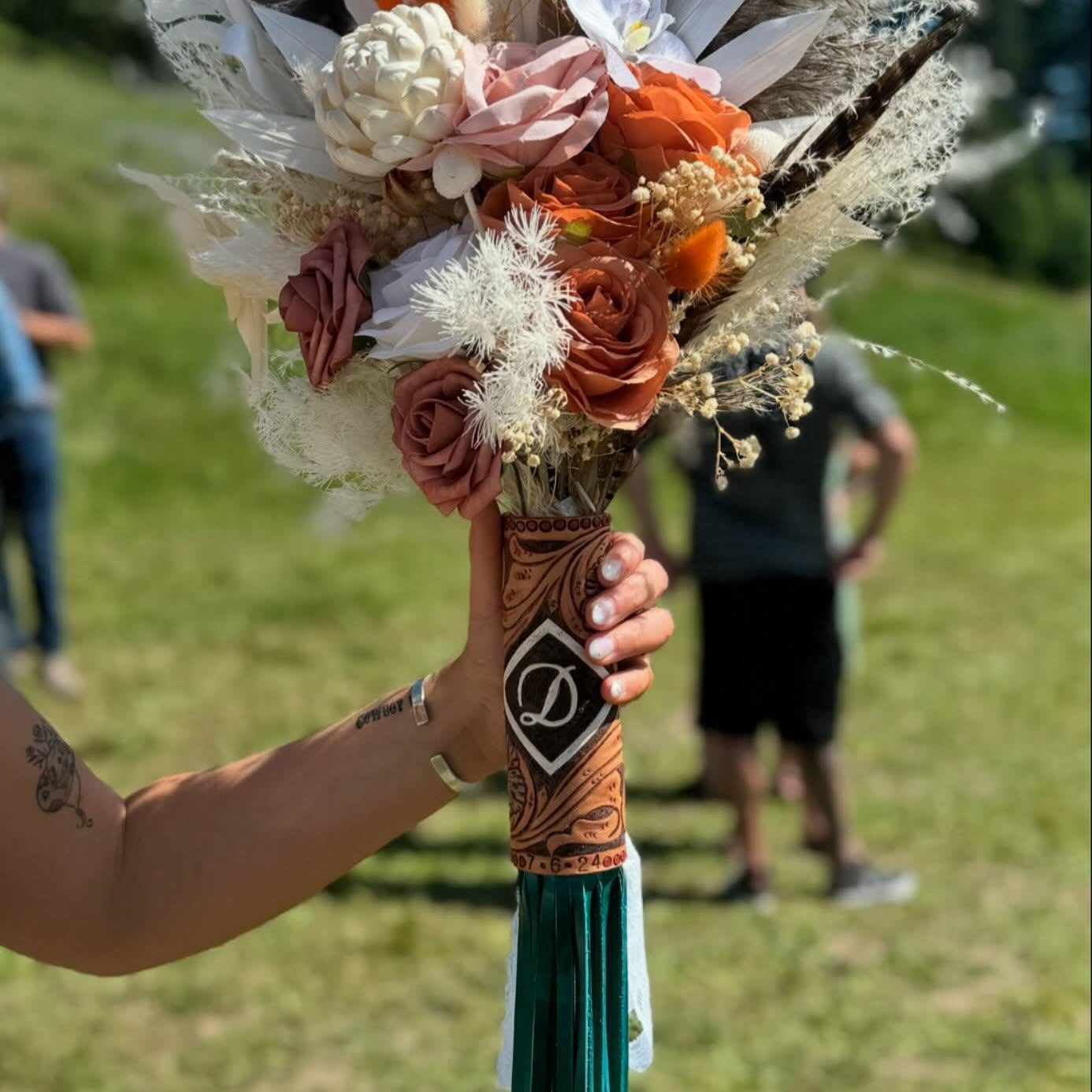 Elevate your bridal presentation with this custom hand-tooled leather bouquet wrap, meticulously crafted to complement your wedding day aesthetic. Each piece is individually tooled with intricate detailing, transforming a functional accessory into a heirloom-quality keepsake. The supple leather molds naturally to your bouquet's contours while providing a secure, comfortable grip throughout your ceremony and reception. Perfect for brides seeking a distinctive alternative to traditional wraps, this artisan creation adds timeless elegance and personal sophistication to your floral arrangement.