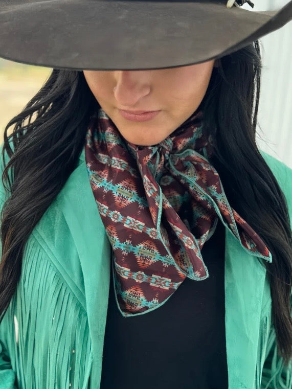Introducing the Bermuda Bay Wild Rag-featuring a playful Aztec print on a smooth brown fabric with vibrant turquoise trim. This versatile accessory adds a pop of color to any outfit and is perfect for spicing up your wardrobe. Stay stylish with the Bermuda Bay Wild Rag!